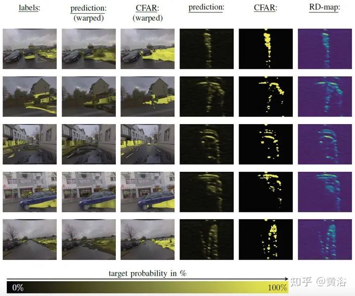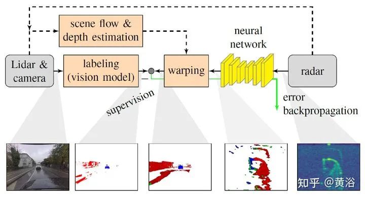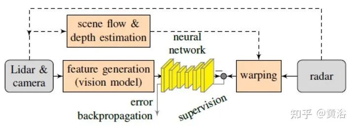 将雷达的range-Doppler (RD) spectrum投射到摄像头平面。由于设计的warping函数可微分,所以在训练框架下做BP。该warping操作依赖于环境精确的scene flow,故提出一个来自激光雷达、摄像头和雷达的scene flow估计方法,以提高warping操作精度。实验应用涉及了direction-of-arrival (DoA) estimation, target detection, semantic segmentation 和 estimation of radar power from camera data等。