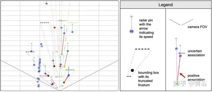 illustration of radar pins, bounding boxes, and association relationships under BEV perspective