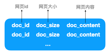 爬完网页,网页该如何存储呢,有人说一个网页存一个文件不就行了,如果是这样,10 亿个网页就要存 10 亿个文件,一般的文件系统是不支持的,所以一般是把网页内容存储在一个文件(假设为 doc_raw.bin)中,如下