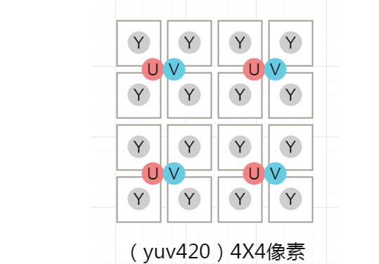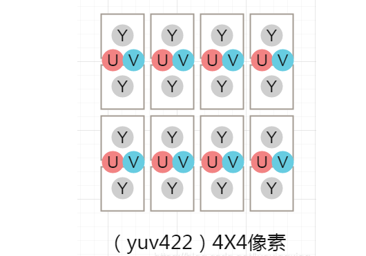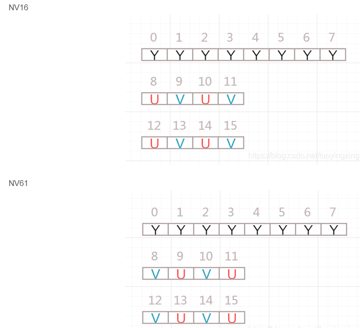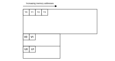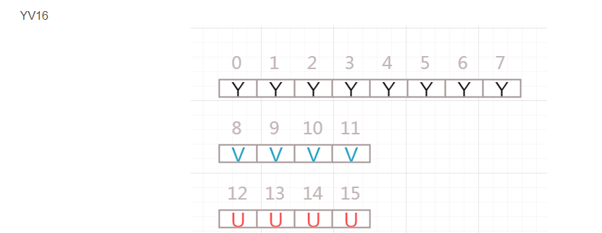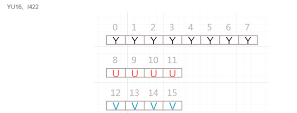 如上图所示,1个像素使用2个字节表示,Y占8位,U和V分别占半个字节,即4位。