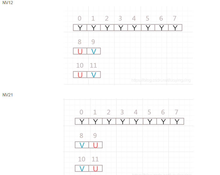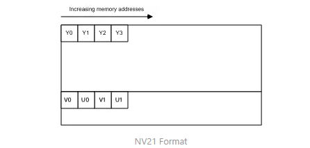 NV21 属于 YUV420SP,与 NV12 几乎一致,区别是 UV 平面中 U 与 V 的排列顺序颠倒,以 V, U, V, U 的顺序交错排列,内存排列如图所示: