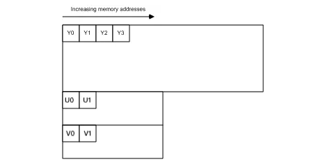 YUV420采用4:2:0表示,一个像素占12比特位,8bit的Y + 2bit的U+ 2bit的V,Y,U,V存储采用三平面格式,如下所示: