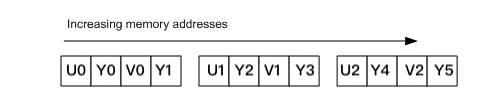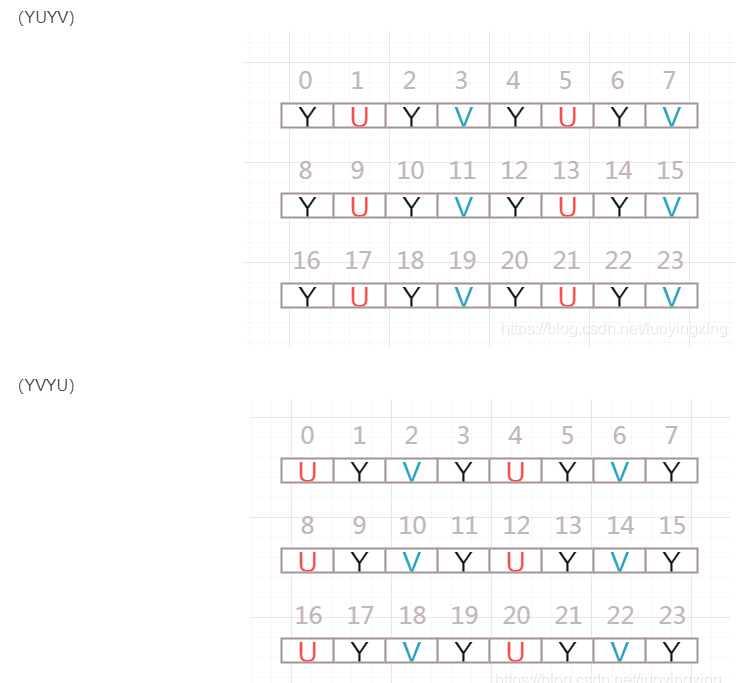 UYVU采用4:2:2格式,每个像素占16比特位,UYVY 与 YUYV 类似,只是亮度(Y)分量与色度(UV)分量排列顺序颠倒,如下图所示: