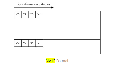 NV12 属于 YUV420SP 格式,两个平面,分别存储 Y 分量 和 UV 分量。其中 UV 分量共用一个平面并且以 U, V, U, V 的顺序交错排列。每四个 Y 分量共享一组 UV 分量。UV 平面的 strides, width 与 Y 平面一样长,但 height 仅为 Y 平面的一半。因此一个像素 12 bits,内存排列如下图所示: