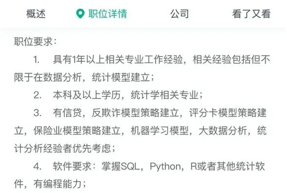 打开求职软件,选金融行业,并搜索关键字“数据分析”,可以看到许多岗位。一般这些岗位的JD(职位描述)长这样: