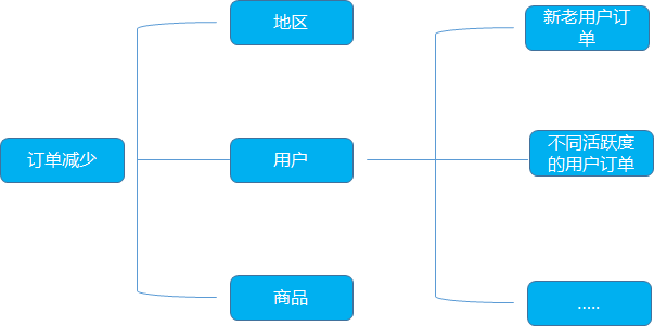 比如某个电商平台的订单降低, 我们利用逻辑树的拆解从地区, 用户, 商品类型等多个维度去思考。