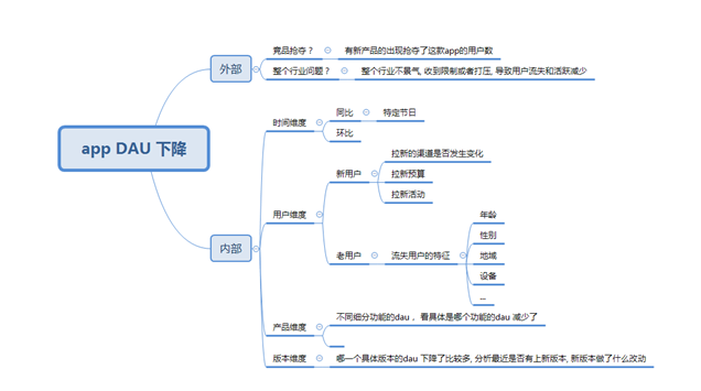 某电商app DAU 跌了, 需要分析为什么dau 会跌, 这也是数据分析面试经典的问题, 在回答这个问题的时候, 为了使得我们的答案具有结构化和条理化, 需要应用逻辑树分析法