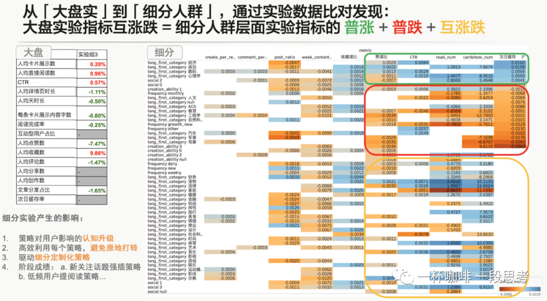 在这个阶段,数据评估层面需要做系统改善来保障决策的科学性。实际上很大概率成立的一个事实是:把所有用户当做一个大盘整体来评估用户体验是低效且失真的,策略在大盘层面的「表象影响」是细分用户群体层面的「实际影响」的累加,而「实际影响」在不同用户群体之间可能存在显著差异。下图内容平台的实验数据就是一个典型:大盘(左)数据表现出来的留存不显著+二级指标互涨跌实际上是细分用户群体后指标普涨、普跌、互涨跌。