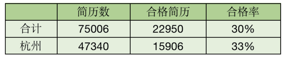 在Lucky入职那一年,内推+正式校招的简历数明显增加,但可以通过下表发现简历的合格率并不高,连50%都没有达到。简历是技术人找工作的基本资料,如同身份证一样重要。