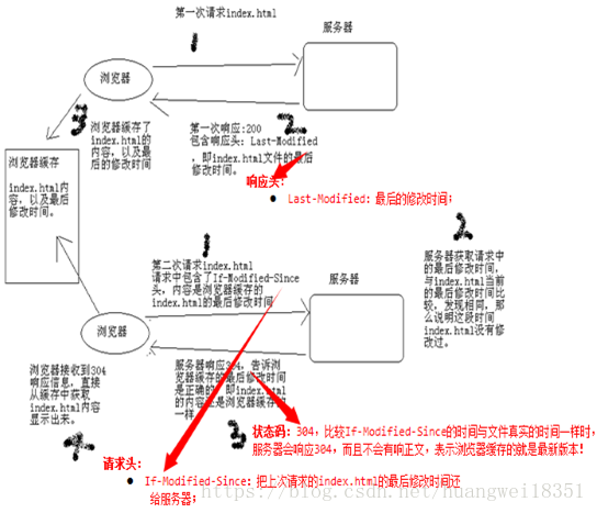 | 304 | 当用户第一次请求index.html时,服务器会添加一个名为last-Modified响应头,这个头说明了index.html的最后修改时间,浏览器会把index.html内容,以及最后的响应时间缓存下来。当用户第二次请求index.html时,在请求中包含一个if-modified-since请求头,它的值就是第一次请求时服务器通过last-modified响应头发送给浏览器的值,即index.html最后的修改时间,if-modified-since请求头就是在告诉服务器,我这里浏览器缓存的index.html最后的修改时间是这个,您看看现在的index.html最后修改的时间是不是这个,如果是,那就不用响应这个请求,我直接把缓存中的内容显示出来即可。服务器获取if-modified-since值,与index.html的当前最后修改时间比对,如果相同,服务器发送响应码304,表示index.html与上次浏览器缓存的相同,无需再次发送,浏览器显示自己的缓存页面,如果不同,那么说明index.html已经进行了修改,服务器响应200 |