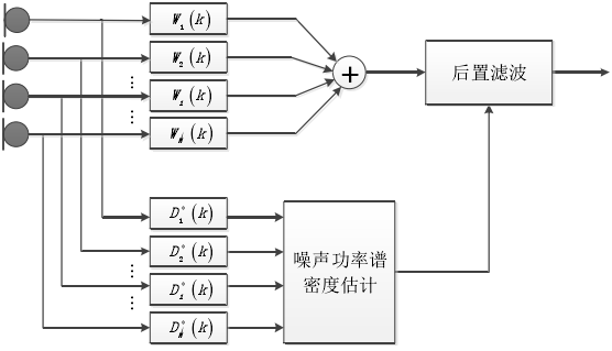 当噪声干扰信号不是点声源或有太多的干扰噪声从不同方向到达麦克风阵列时,波束形成器的降噪能力是有限的。同时非稳定干扰噪声的存在也会影响自适应波束形成器对噪声的抑制效果。在自适应波束形成的输出后接入一个后置滤波器可以有效地抑制残留噪声,如非相干噪声、散射噪声等。由于指向性波束只能产生有限数量的陷零,这就限制了散射噪声的抑制程度。短时谱估计的后置滤波算法基于期望信号与噪声在时频域的不同,而非空间位置的不同,所以可以有效地抑制散射噪声。