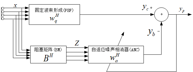 G SC是LCMV的等效实现方式,主要由主路和辅路两部分组成,目标信号从主路通过,噪声和干扰从辅路通过。权矢量可表示为