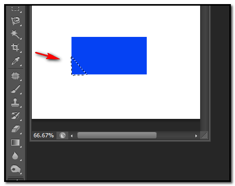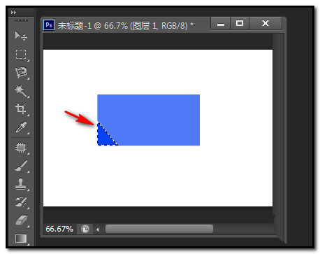 4、现在,要把此长方形其中一个角制作卷边效果。就在左下角制作吧。我们用钢笔工具把左下角选择为选区。