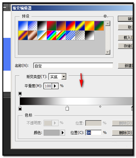 9、点渐变工具;在渐变编辑器这里,如下图所示这样设置。