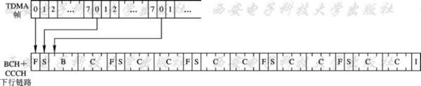 F=FCCH,S=SCH,B=BCCH,C=CCCH(公用控制信道),这么做的缘故是因为PCH,.AGCH都是一对多的信道,所以称之为公用控制信道,PCH,.AGCH在下行0号时隙都是没有固定数量的,可以按需要分配,FS反复出现是因为需要循环播报,确保手机和GSM系统的频率和时间同步,不过这图不是真正的0号时隙的帧结构,真正的0号时隙帧结构有51帧,如图