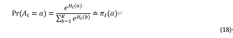 代表当前At得到的奖励Rt,如果比之前得到的奖励的平均值大,就提高它的优先度量,即在后续行动中选择它的概率进一步提高,反之亦然;其它行动的概率变化总是与At的相反(因为总概率为1)。