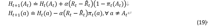 H[a[t]] = H_At_old + alpha*(r[t]-average_reward)*(1-P[a[t]])