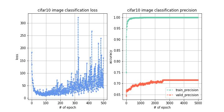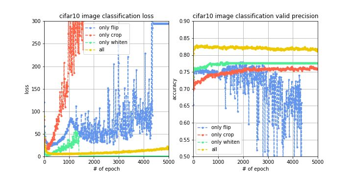 结果分析:我们观察训练曲线和验证曲线,很明显地发现图像白化的效果好,其次是图像切割,再次是图像翻转,而如果同时使用这三种数据增强技术,不仅能使训练过程的loss更稳定,而且能使验证集的准确率提升至82%左右,提升效果十分明显。而对于测试集,准确率也提升至80.42%。说明图像增强确实通过增加训练集数据量达到了提升模型泛化能力以及鲁棒性的效果,从准确率上看也带来了将近10%左右的提升,因此,数据增强确实有很大的作用。但是对于80%左右的识别准确率我们还是不够满意,接下来继续调参。