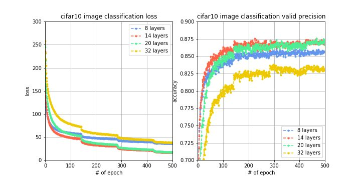结果分析:我们惊讶的发现,加深了网络层数之后,性能反而下降了,达不到原来的验证集准确率,网络层数从8层增加到14层,准确率有所上升,但从14层增加到20层再增加到32层,准确率不升反降,这说明如果网络层数过大,由于梯度衰减的原因,导致网络性能下降,因此,需要使用其他方法解决梯度衰减问题,使得深度神经网络能够正常work。