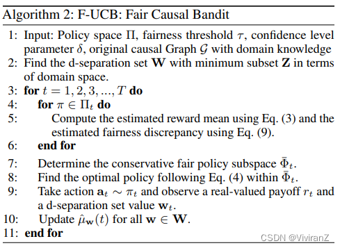 这个优化可以通过遵循OFU的规则类似地解决。算法2描述了我们称为F-UCB的公平强盗算法。与D-UCB算法不同,F-UCB在每个时间t只从Φ¯ t中挑选手臂。在第5行,我们计算估计的奖励平均值和估计的公平差异。在第6行,我们确定公平策略子空间Φ¯ t,在第7行,我们找到最佳策略πt = ![]()