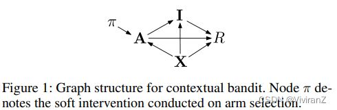 我们主张使用因果图和软干预作为任何匪徒算法的一般表示方法。我们考虑因果图G,例如,如图1所示,其中A代表手臂特征,X代表用户特征,R代表奖励,I代表A和R之间的一些中间特征。由于手臂选择过程可以被视为X对A的结构方程,我们将X视为A的父母。然后,奖励R受到手臂选择、上下文用户特征以及一些中间特征的影响,因此所有这三个因素都是R的父母。在这种情况下,很自然地将手臂选择策略的更新视为对手臂特征A进行的软干预π。