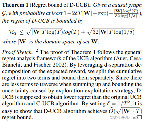 我们假设,d分离集W的选择将显著影响D-UCB的遗憾。为此,我们分析了累积遗憾RT的上界。下面的定理表明,遗憾的上界取决于d-分离集W的域大小。