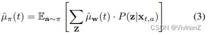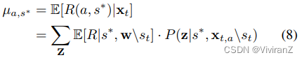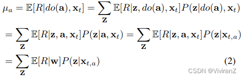 其中最后一步是由于d分离。与(Lu et al. 2020)类似,我们假设根据以前用于建立因果图的知识,分布P(z|xt,a)是已知的。然后,通过使用样本平均数估计器(用μˆw(t)表示)来估计基于截至时间t的观察数据的E[R|w],估计的奖励平均数由以下公式给出