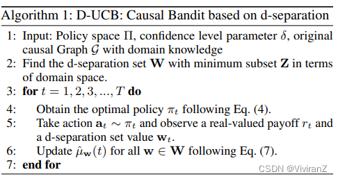 算法1显示了D-UCB的伪代码。在第2行,根据定理1,我们首先确定具有最小领域空间的d分离集W。在第4行,我们利用因果图和截至时间t的观察数据,找到最佳策略πt =