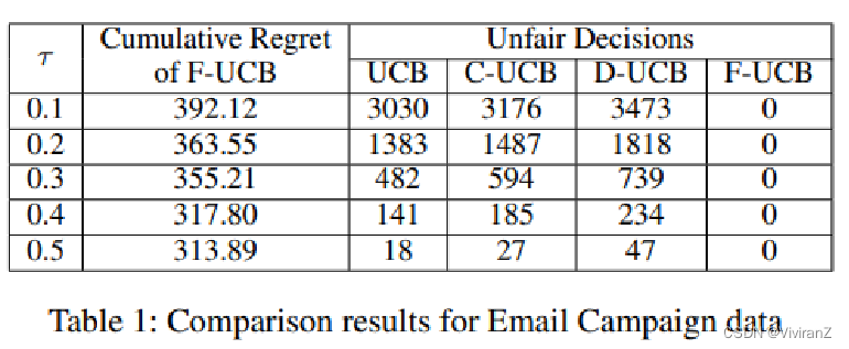表1显示了F-UCB(T=5000回合)的累积遗憾是如何随公平性阈值τ变化的。表1(和表2)中的数值是通过对5次试验的结果进行平均得到的。τ越大,累积遗憾越小。在表1的右边部分,我们进一步报告了其他三种算法在T=5000轮的探索过程中违反公平性的次数,这表明了公平性意识的匪徒的必要性。相比之下,我们的F-UCB在每一轮都实现了严格的反事实公平性。