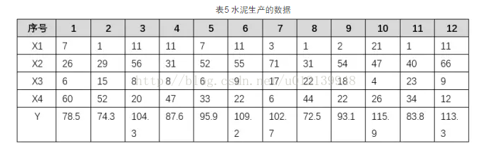 X=[7,26,6,60;1,29,15,52;11,56,8,20;11,31,8,47;7,52,6,33;11,55,9,22;3,71,17,6;1,31,22,44;2,54,18,22;21,47,4,26;1,40,23,34;11,66,9,12]; %自变量数据