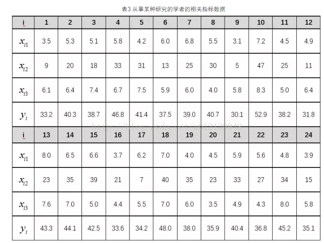 [ 例3 ] 某科学基金会希望估计从事某研究的学者的年薪 Y 与他们的研究成果(论文、著作等)的质量指标 X1、从事研究工作的时间 X2、能成功获得资助的指标 X3 之间的关系,为此按一定的实验设计方法调查了 24 位研究学者,得到如表3 所示的数据( i 为学者序号),试建立 Y 与 X1 , X2 , X3 之间关系的数学模型,并得出有关结论和作统计分析。