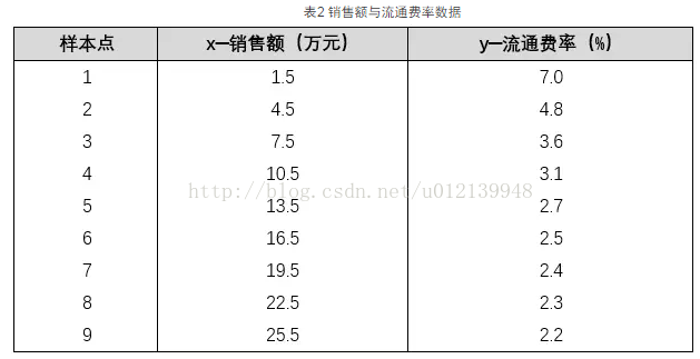 [ 例2 ] 为了解百货商店销售额 x 与流通率(这是反映商业活动的一个质量指标,指每元商品流转额所分摊的流通费用)y 之间的关系,收集了九个商店的有关数据(见表2)。请建立它们关系的数学模型。