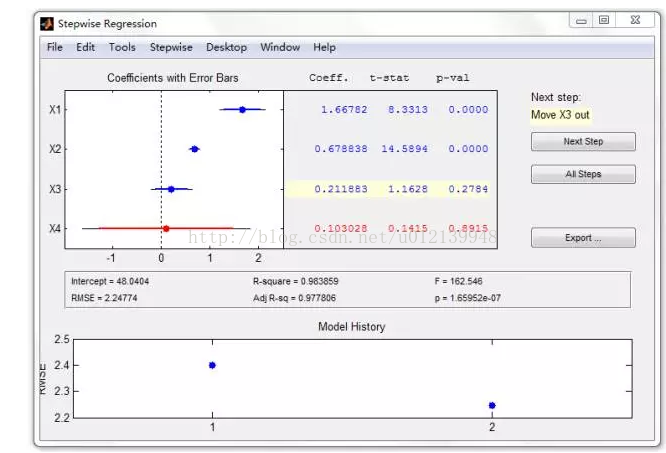 在图 4 中,用蓝色行显示变量 X1、X2、X3、X4 均保留在模型中,窗口的右侧按钮上方提示:将变量X3剔除回归方程(Move X3 out),单击 Next Step 按钮,即进行下一步运算,将第 3 列数据对应的变量 X3 剔除回归方程。单击 Next Step 按钮后,剔除的变量 X3 所对应的行用红色表示,同时又得到提示:将变量 X4 剔除回归方程(Move X4 out),单击 Next Step 按钮,这样一直重复操作,直到 “Next Step” 按钮变灰,表明逐步回归结束,此时得到的模型即为逐步回归最终的结果。