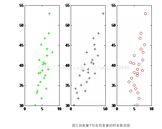 作散点图的目的主要是观察因变量 Y 与各自变量间是否有比较好的线性关系,以便选择恰当的数学模型形式。图3 分别为年薪 Y 与成果质量指标 X1、研究工作时间 X2、获得资助的指标 X3 之间的散点图。从图中可以看出这些点大致分布在一条直线旁边,因此,有比较好的线性关系,可以采用线性回归。绘制图3的代码如下:
