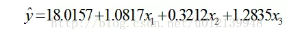 计算结果包括回归系数 b = (β0,β1,β2,β3) = (18.0157, 1.0817, 0.3212, 1.2835)、回归系数的置信区间,以及统计变量 stats(它包含四个检验统计量:相关系数的平方R^2,假设检验统计量 F,与 F 对应的概率 p,s^2 的值)。因此我们得到初步的回归方程为: