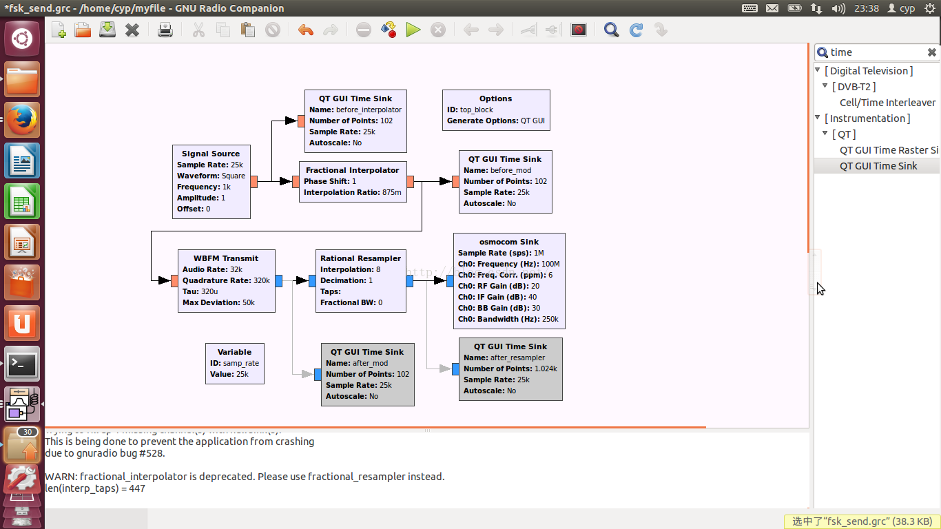 1、在GRC平台下,调制出FSK信号,并通过HackRF进行发送;