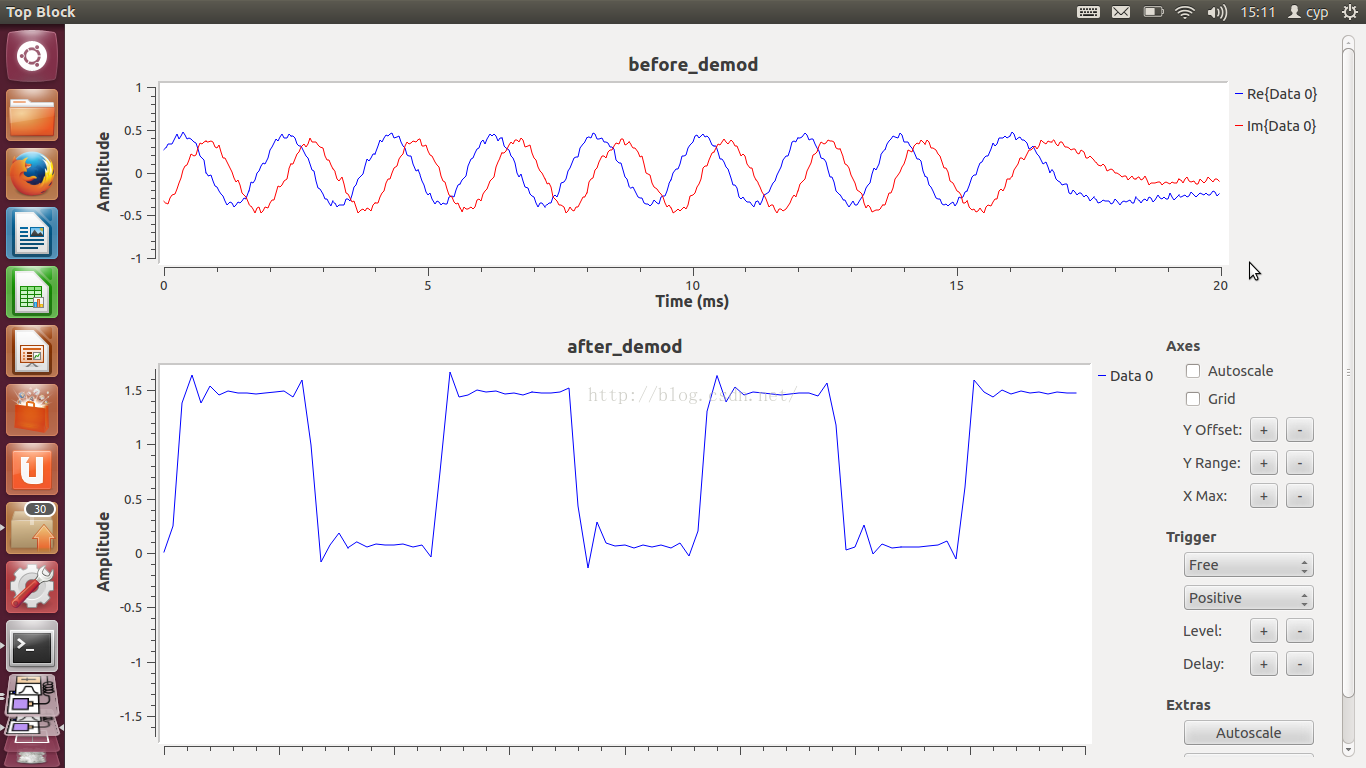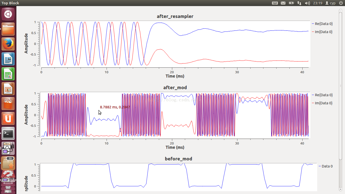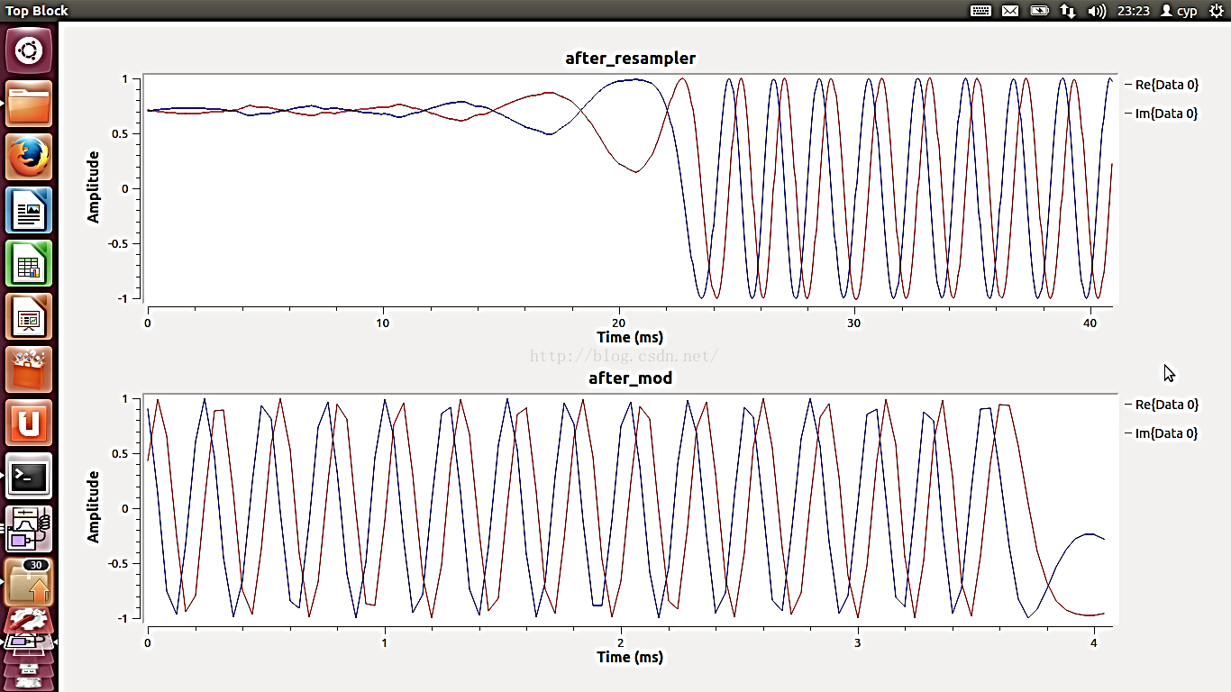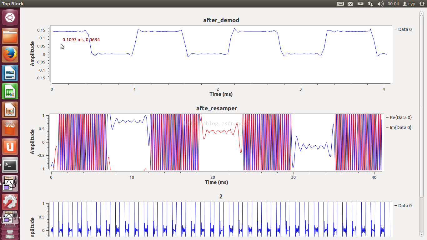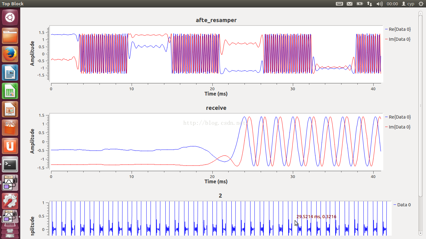 (4)首先还是通过波形进行Rational Resampler模块进行抽取重采样,主要是与发送的端的Rational Resampler模块想对应,是发送信息和接受的信息的速率一样。