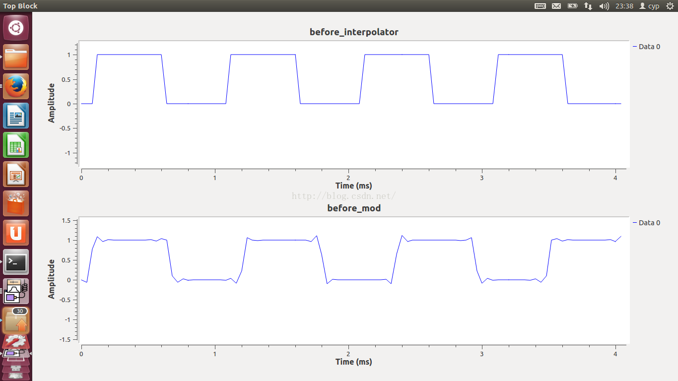 (1)我们要发送的方波,通过Fractional Interpolator 模块,稍稍改变原有的波形,使原来的波形更容易加载到载波上。