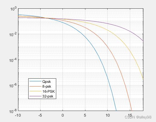 axis([-10 18 10^-8 10^0]);grid on;legend('Qpsk','8-psk','16-PSK','32-psk');