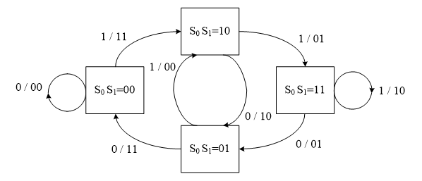 ,每输入1位信息位,产生2位的编码输出。