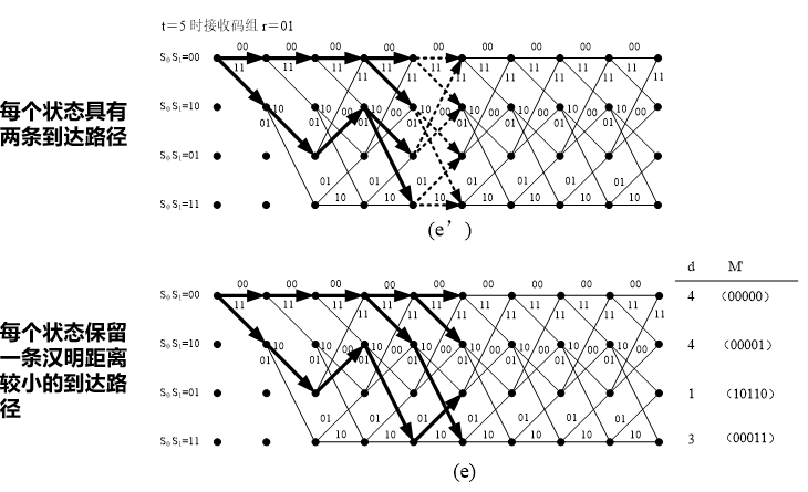 维特比译码过程中的距离:输入序列与网格图中部分路径所对应输出码字序列的汉明(对硬译码)或欧氏(对软译码)距离。