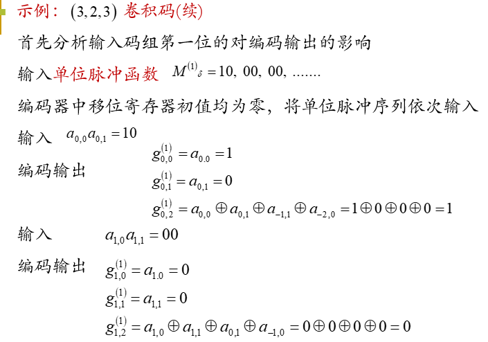 由相应的滤波器的单位脉冲响应,可将卷积码组中每一位的输出与输入的关系,用卷积运算来表示。