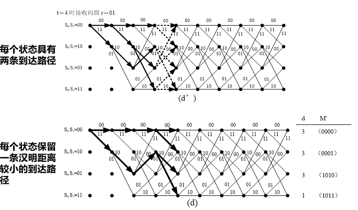 1) 输入一个 n 位的编码码组,计算码组输入后新到达每个状态的2k个可能选留路径的度量值,每个状态仅保留其中度量值最大的路径作为选留路径。如有相同值的路径,则任选其一。