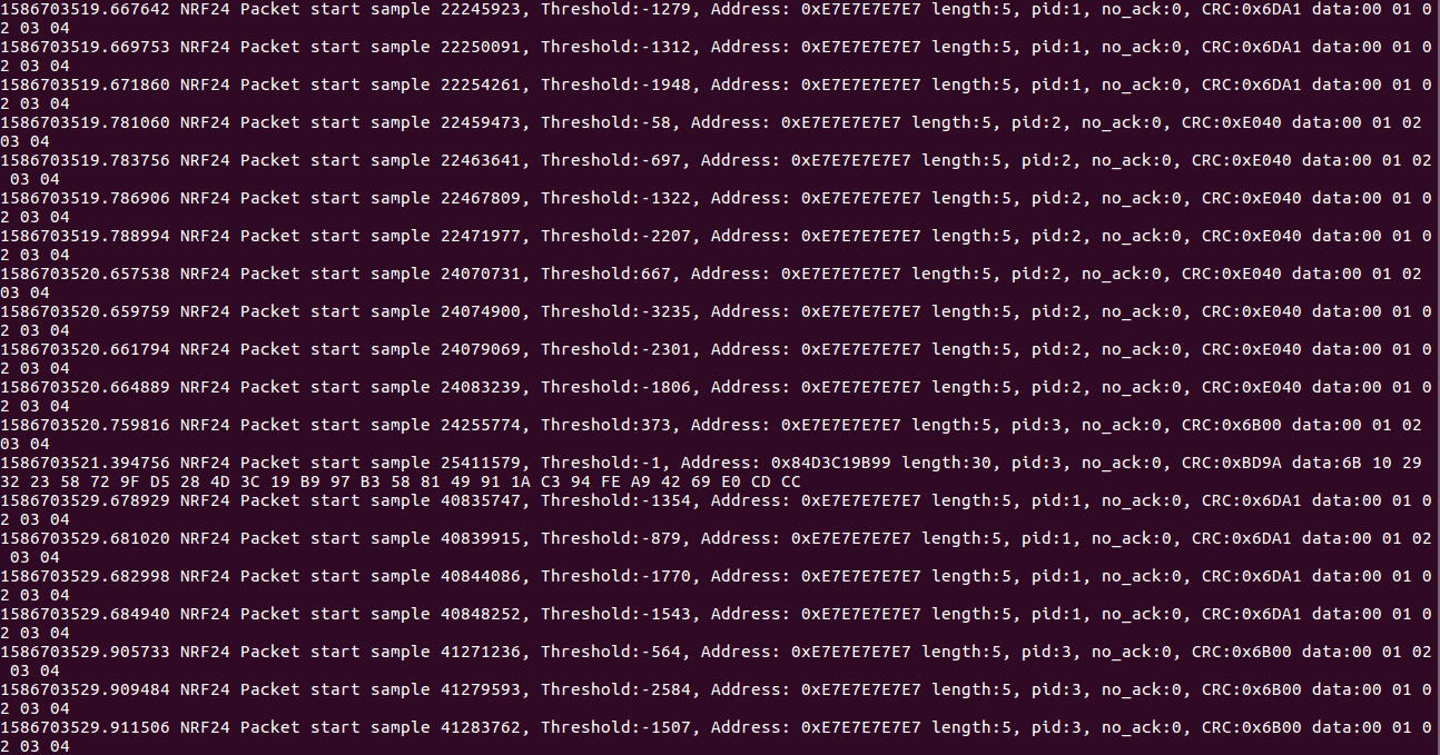 printf("NRF24, Threshold:%"PRId32", Address: 0x%08"PRIX64" ",g_threshold,packet_addr_l);