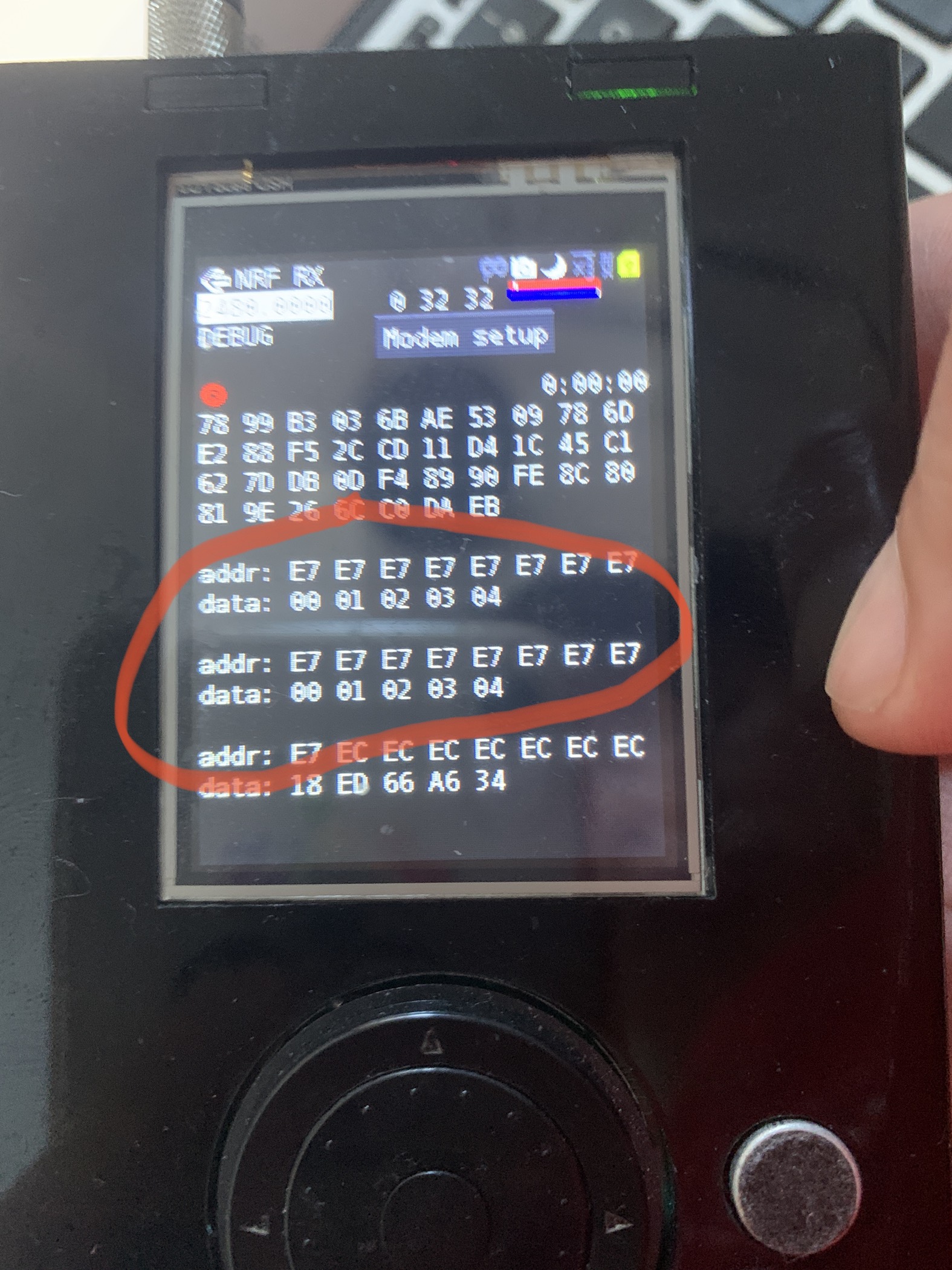 你可以看到大多数数据包的地址是E7E7E7E7E7,就是我们发的数据包了,数据是00 01 02 03 04,这正好是我们前面的python程序里发射的0 1 2 3 4了。