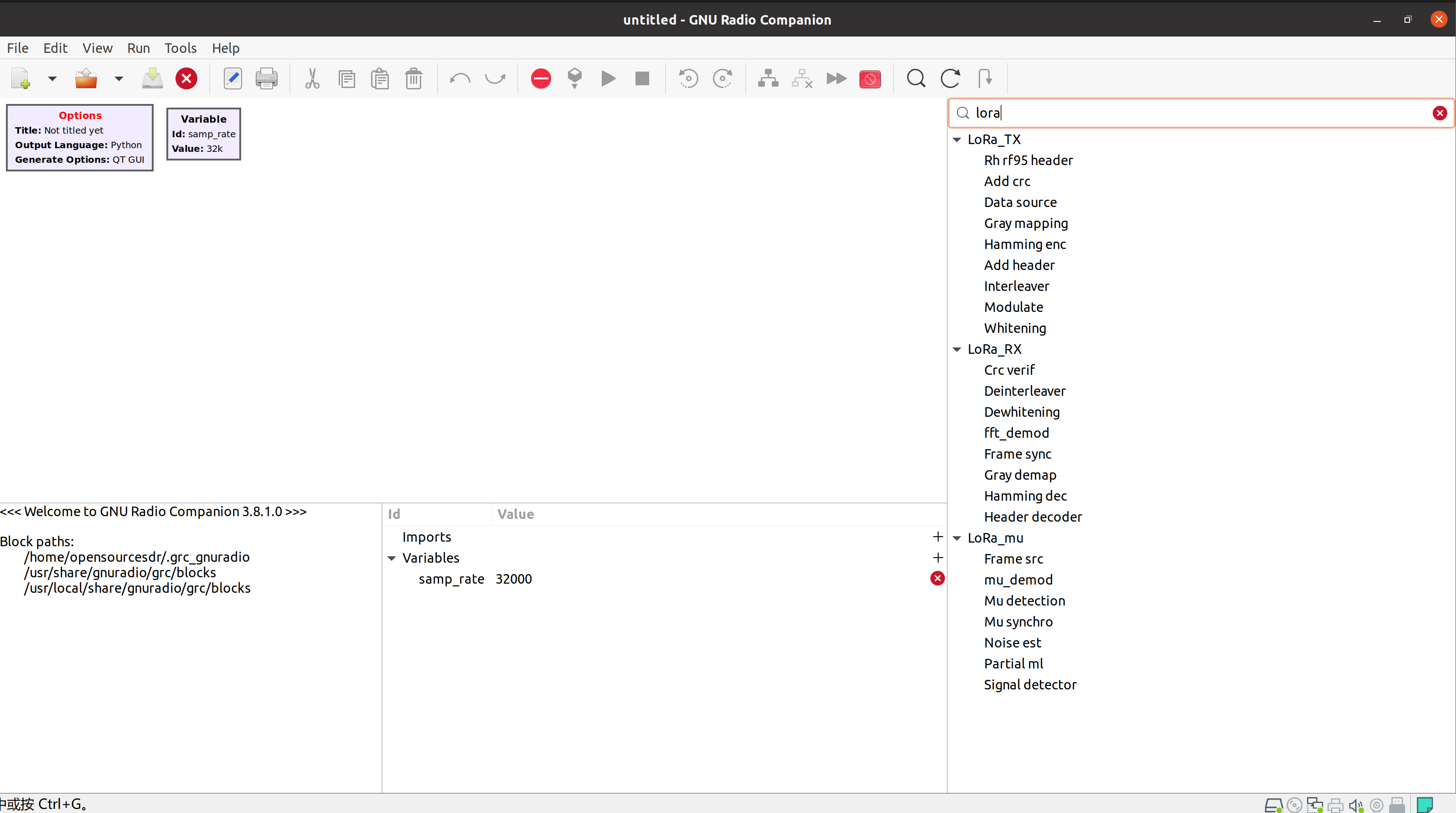 在我们安装gr-lora_sdr之前,在GNU Radio的GRC中,当你在模块搜索栏输入“lora”后,你会发现无法搜索到任何模块。