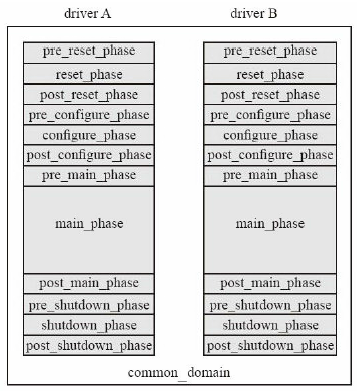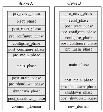 domain把两个时钟域隔开,之后两个domain的各个动态运行的phase 就可以不同步,只能隔离run-time phase,run_phase 和其它function phase 是同步的。(重点!!!)