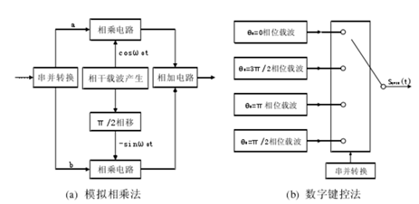 QPSK的调制方法有两种,分别为模拟相乘法和数字键控法,原理框图如下图所示: