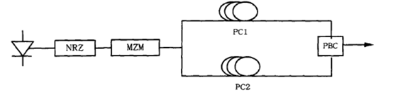 偏振复用系统被提出来以后,对于复用系统的构成在不同的情况下会尝试用不同的方式来实现,不过一般大同小异的采用了常用的偏振器件如:偏振合束器(Polarization beam combiner, PBC)、偏振控制器(Polarization controller, PC)以及波片等。仅采用了PBC与PC的进行偏振复用,结构图如下图所示: