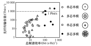 当前, 光传输系统的研究正在经历一个新概念、新技术层出不穷的极度活跃的发展时期. 光的幅度、时间/频率、正交相位和偏振4个物理维度已通过高阶调制格式、数字相干接收、偏振复用、频分复用等光传输技术被利用到接近极限, 多模多芯等空间维度也被相继开发, 促进了系统容量的不断提升. 光纤通信向单信道速率1Tb/s演进, 单纤容量向 100 Tb/s 发展, 已接近普通商用单模光纤传输系统的香农极限. 未来, 光纤通信将由 Tbit 级向 Pbit 级, 甚至 Ebps, Zbps 级演进, 将主要依赖于空分复用技术。